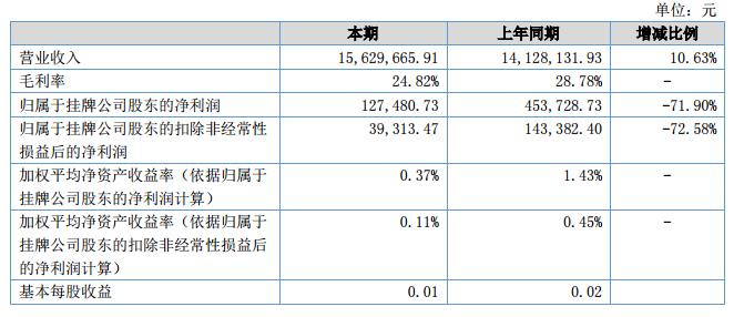 報(bào)告期內(nèi),公司營業(yè)收入15,629,665.91元,較去年同期上升10.63%。收入上升主要是因?yàn)楸酒陧?xiàng)目完工收入比上年同期增加。凈利潤本期為127,480.73元,上年同期為453,728.73元。利潤減少主要是因?yàn)楸酒谑杖肫骄实陀谏夏晖凇?