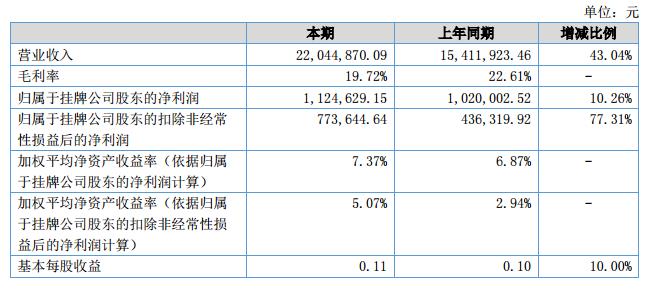 報告期內(nèi)公司實現(xiàn)營業(yè)收入22,044,870.09元,同比增長43.4%,歸屬于掛牌公司股東的凈利潤為1,124,629.15元。截止報告期末,公司總資產(chǎn)為19,816,208.68元,凈資產(chǎn)為15,815,905.60元。?