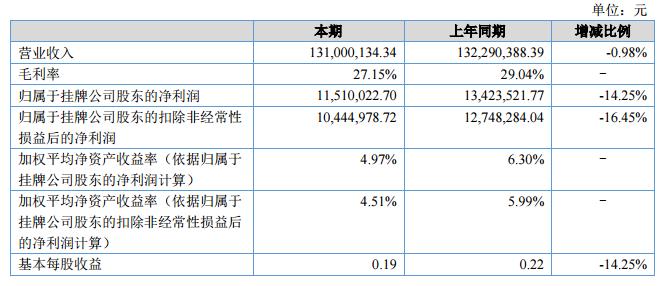 報告期內(nèi)公司實(shí)現(xiàn)營業(yè)收入為131,000,134.34元,比上年度同期132,290,388.39元相比,下降0.98%;營業(yè)成本95,429,256.13元,比上年同期93,872,025.15元相比,增加1.66%;實(shí)現(xiàn)凈利潤11,449,043.10元,與去年同期13,346,613.18元相比,下降14.22%。?