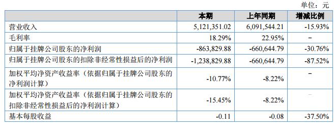 報(bào)告期內(nèi),公司實(shí)現(xiàn)營(yíng)業(yè)收入512.14萬(wàn)元,較上年同期減少15.93%;報(bào)告期內(nèi)歸屬于公司股東的凈利潤(rùn)為-86.38萬(wàn)元,比上年同期減少了20.32萬(wàn)元,增減比例為-30.76%。?