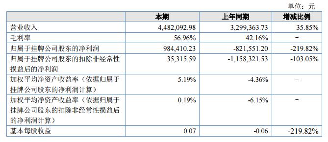 報(bào)告期內(nèi)公司實(shí)現(xiàn)營業(yè)收入4,482,092.98元,與去年同期比增長35.85%;凈利潤984,410.23元,同比增長219.82%。?