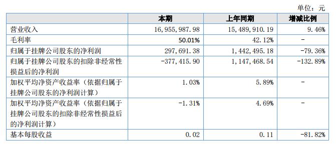 報告期內(nèi)實現(xiàn)營業(yè)收入1,695萬元,較上年同期增長9.46%,實現(xiàn)利潤29.77萬元,較去年同期降低了79.36%。本報告期末,公司總資產(chǎn)為10,769萬元元,凈資產(chǎn)為2,901萬元。?