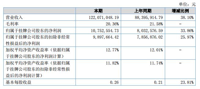 報(bào)告期內(nèi)公司實(shí)現(xiàn)營(yíng)業(yè)收入122,071,048.19元,較上年同期營(yíng)業(yè)收入增加33,675,133.4元,同比增長(zhǎng)38.10%;?歸屬于掛牌公司股東的凈利潤(rùn)為10,752,554.73元,較上年同期歸屬于掛牌公司股東的凈利潤(rùn)增加2,719,978.14元,同比增長(zhǎng)33.86%。?