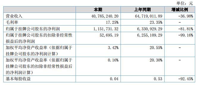 報告期內(nèi)公司實現(xiàn)營業(yè)收入為40,785,240.20元,較去年同期營業(yè)收入下降了23,933,771.69元,下降幅度為36.98%;公司實現(xiàn)營業(yè)利潤1,051,146.15元,凈利潤為1,151,731.32元,較上年同期分別下降了6,152,157.95元、5,179,197.97元,下降比率分別為85.41%,81.81%。?