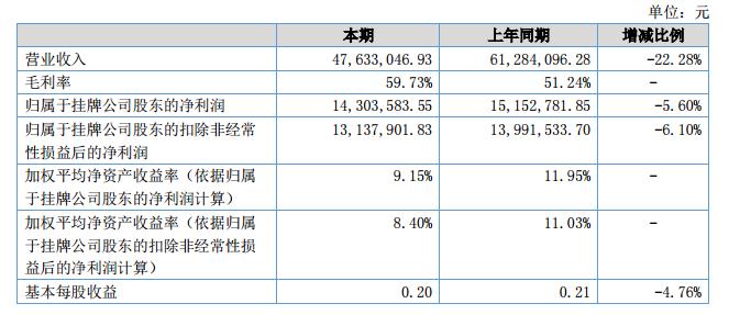 報(bào)告期內(nèi)公司實(shí)現(xiàn)營業(yè)收入4,763.3萬元,較去年同期同比減少22.28%;公司實(shí)現(xiàn)凈利潤1,430.36萬元,較去年同期同比減少5.6%。?