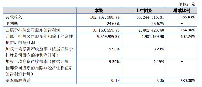 報(bào)告期內(nèi)公司實(shí)現(xiàn)營(yíng)業(yè)收入10,243.80萬元,上年同期5,524.45萬元,同比增加4,719.35萬元,增幅85.43%;歸屬于掛牌公司股東的凈利潤(rùn)1,016.06萬元,上年同期286.24萬元,歸屬于掛牌公司股東的凈利潤(rùn)同比增加729.81萬元,增幅254.96%。?
