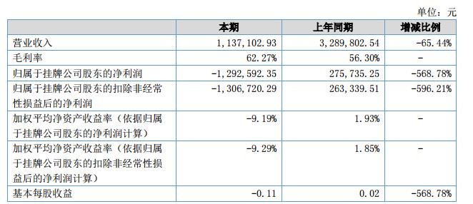 報告期內(nèi)公司實際銷售收入113.71萬元,同比減少65.44%;實現(xiàn)凈利潤-129.26萬元。?