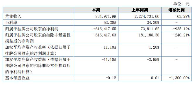 報告期內(nèi)公司實現(xiàn)營業(yè)收入834,971.99元,同比減少63.25%;營業(yè)成本390,769.14元,同比減少73.89%;凈利潤為-616,417.55元,同比減少935.12%。?