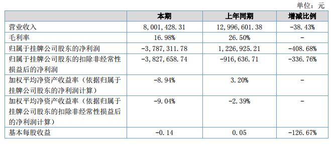報告期內(nèi)公司主營業(yè)務收入合計800.14萬元,相比去年同期-38.43%;報告期內(nèi)實現(xiàn)凈利潤-378.73萬元,相比去年同期-408.68%,?
