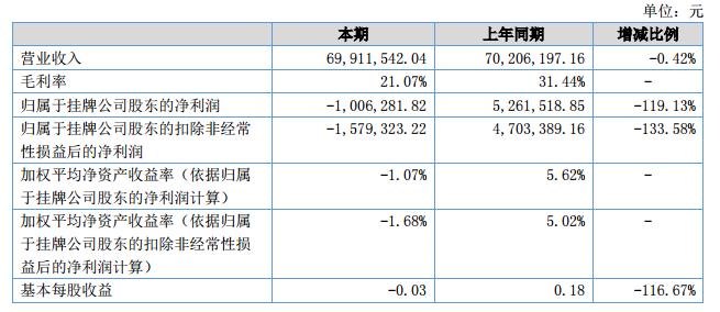 截至報告期末,公司總資產(chǎn)為206,944,008.45元,較期初減少8.75%;負(fù)債總額113,322,935.36元,較期初減少14.26%,歸屬于掛牌公司股東的凈資產(chǎn)為93,621,073.09元,較期初減少1.06%。報告期內(nèi),公司實現(xiàn)營業(yè)收入69,911,542.04元,較上年同期減少0.42%;實現(xiàn)歸屬掛牌公司股東的凈利潤-1,006,281.82,較上年同期下降119.13%。