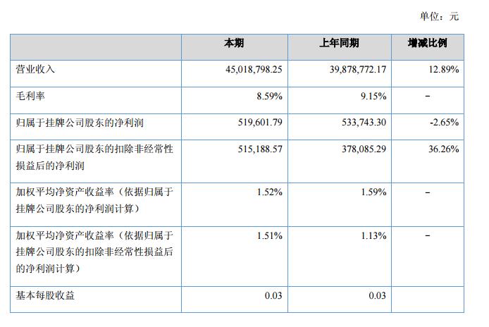 報(bào)告期內(nèi)公司實(shí)現(xiàn)營(yíng)業(yè)收入45,018,798.25元,上年同期39,878,772.17元,同比上漲12.89%;報(bào)告期實(shí)現(xiàn)凈利潤(rùn)519,601.79元,上年同期533,743.30元,同比下降2.65%。?
