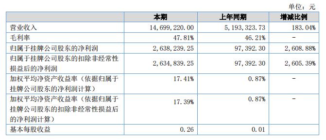 公司在報(bào)告期內(nèi)的主營業(yè)務(wù)收入為14,699,220.00元,2017年同期主營業(yè)務(wù)收入5,193,323.73元,比上年同期增長9,505,896.27元,變動比例為183.04%;報(bào)告期內(nèi)實(shí)現(xiàn)凈利潤為2,638,239.25元,2017年同期實(shí)現(xiàn)凈利潤97,392.30元,比上年同期增長2,540,846.95元,變動比例2,608.88%。?
