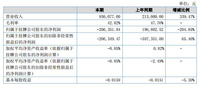 公司報(bào)告期內(nèi)實(shí)現(xiàn)營業(yè)收入936,077.00元,上年同期收入為213,000.00元,同比增長了339.47%,主要是今年公司加強(qiáng)了市場(chǎng)營銷策略,加大對(duì)產(chǎn)品宣傳力度;本期凈利潤為-206,351.84元,上年同期凈利潤為196,802.52元,較上年同期下降204.85%?