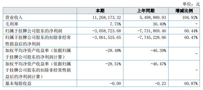 報(bào)告期內(nèi),公司實(shí)現(xiàn)營(yíng)業(yè)收入11,268,173.32元,比去年同期增長(zhǎng)104.92%;營(yíng)業(yè)成本10,394,931.36元,比去年同期增長(zhǎng)197.22%;凈利潤(rùn)-3,058,723.68元,比去年同期增長(zhǎng)60.44%;經(jīng)營(yíng)活動(dòng)產(chǎn)生的現(xiàn)金流量金額-2,076,237.89元,比去年同期增長(zhǎng)72.29%。?