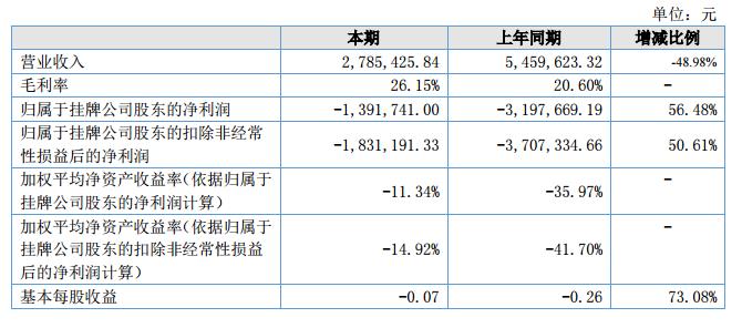 報告期內(nèi)公司實現(xiàn)營業(yè)收入2,785,425.84元,比上年同期5,459,623.32元減少2,674,197.48元,減少了48.98%;凈利潤-1,391,741.00元,與上年同期相比,雖然虧損減少,但仍然處于虧損狀態(tài)。?