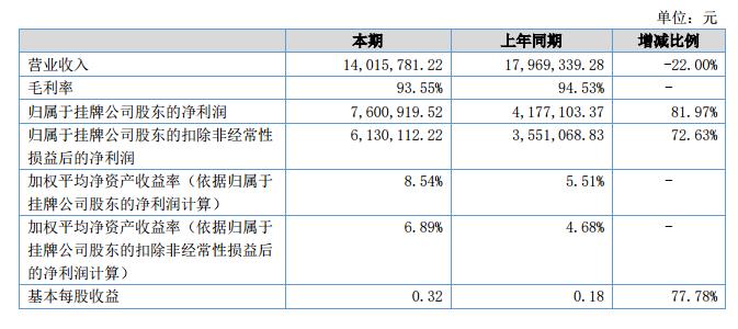 報告期內(nèi)公司營業(yè)收入:14,015,781.22元,同比減少22.00%;營業(yè)成本:904,698.03元,同比減少7.89%;凈利潤:7,600,919.52元,同比增加81.97%。