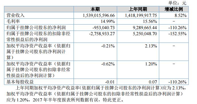 報(bào)告期內(nèi)公司實(shí)現(xiàn)營(yíng)業(yè)收入153901.56萬元,比去年同期增長(zhǎng)8.52%;實(shí)現(xiàn)歸屬于母公司股東的凈利潤(rùn)-95.30萬元,比去年同期下降110.26%。?