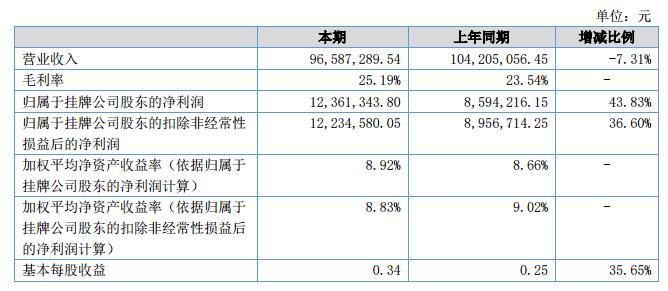 報(bào)告期內(nèi)公司實(shí)現(xiàn)營業(yè)收入9,658.73萬元,同比下降7.31%;凈利潤為1,236.13萬元,同比增長43.83%。?