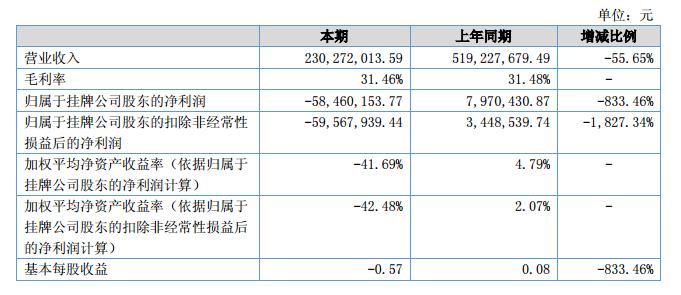 報(bào)告期內(nèi)公司營業(yè)收入23,027.20萬元,同比減少55.65%;營業(yè)成本15,782.04萬元,同比減少55.64%;凈利潤-5,846.02萬元,同比減少-833.46%。?