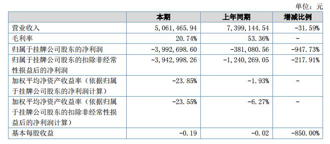 報(bào)告期內(nèi),公司實(shí)現(xiàn)營(yíng)業(yè)收入506.15萬(wàn)元,較上年同期減少31.59%;營(yíng)業(yè)成本401.18萬(wàn)元,較上年同期增加16.26%;毛利率為20.74%,同比降低32.62個(gè)百分點(diǎn);歸屬于掛牌公司股東的凈利潤(rùn)-399.27萬(wàn)元,同比降低947.73%。