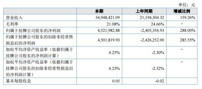 報(bào)告期內(nèi),公司實(shí)現(xiàn)營(yíng)業(yè)收入5,494.84萬(wàn)元,同比增長(zhǎng)159.26%,歸屬于掛牌公司股東的凈利潤(rùn)為452.20萬(wàn)元,同比增長(zhǎng)288.00%。?