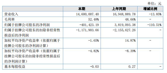 報(bào)告期內(nèi),公司的營業(yè)收入為14,600,007.40元,較上年同期下降了2,348,882.38元;營業(yè)成本6,937,783.46元,較上年同期下降了1,764,568.07元;凈利潤-401,423.19元,較上年同期減少4,220,516.57元。