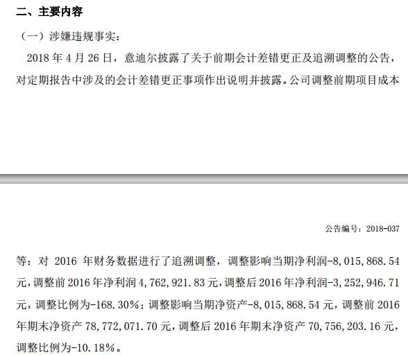 2018年4月26日,意迪爾披露了關(guān)于前期會(huì)計(jì)差錯(cuò)更正及追溯調(diào)整的公告, 對定期報(bào)告中涉及的會(huì)計(jì)差錯(cuò)更正事項(xiàng)作出說明并披露,公司調(diào)整前期項(xiàng)目成本等。