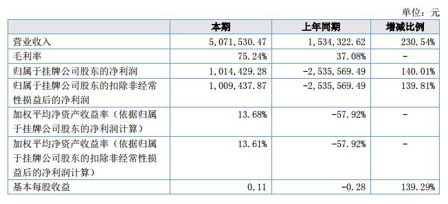 報(bào)告期內(nèi),公司實(shí)現(xiàn)營業(yè)收入507.15萬元,凈利潤101.44萬元,收入比上年同期增長230.54%利潤也由虧損轉(zhuǎn)為盈利,基本每股收益報(bào)告期為0.11元,上期為-0.28,綜合毛利率75.24%,報(bào)告期內(nèi)經(jīng)營情況呈良性趨勢發(fā)展。?