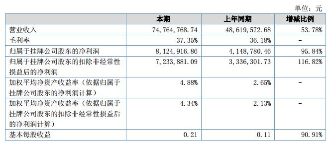 報(bào)告期內(nèi)公司實(shí)現(xiàn)營(yíng)業(yè)收入7,476.48萬(wàn)元,較去年同期增長(zhǎng)53.78%;利潤(rùn)總額和凈利潤(rùn)分別為883.41萬(wàn)元和726.10萬(wàn)元,分別同比增加82.76%和75.89%。?