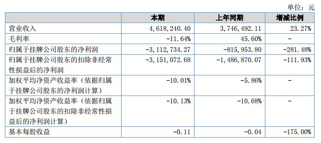 報告期實現(xiàn)營業(yè)收入為4,618,240.40元,同比增長23.27%;?凈利潤-3,112,734.27元,同比增長-281.48%。