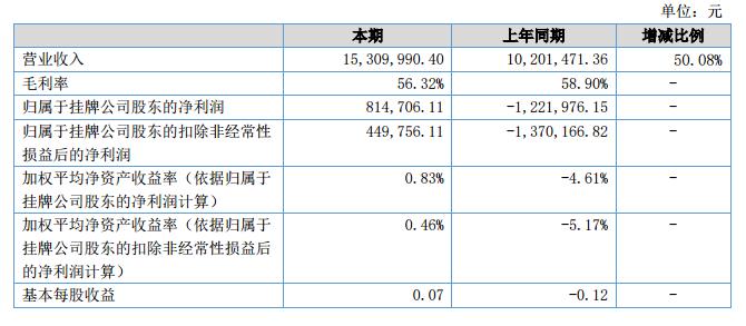 報(bào)告期內(nèi),公司實(shí)現(xiàn)營(yíng)業(yè)收入15,309,990.40元,較去年同期同比增長(zhǎng)50.08%,?凈利潤(rùn)714,706.11,較去年同期同比有所增長(zhǎng)。