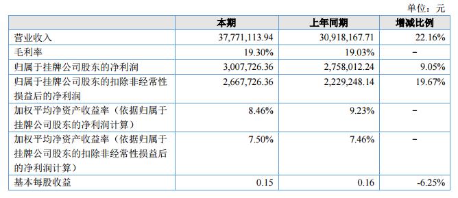 報(bào)告期內(nèi)公司營業(yè)收入為3,777.11萬元,同比增長22.16%;公司實(shí)現(xiàn)歸屬于掛牌公司股東的凈利潤為300.77萬元,較上年增加24.97萬元,同比增長9.05%。?