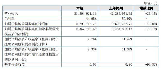 報(bào)告期內(nèi)公司實(shí)現(xiàn)營(yíng)業(yè)收入31,304,021.19元,較上年同期42,386,951.92元下降26.15%;?公司實(shí)現(xiàn)凈利潤(rùn)2,799,718.78元,同比增長(zhǎng)-70.86%。