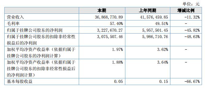 報告期內(nèi),公司實現(xiàn)營業(yè)收入3,686.87萬元,同比降低11.32%;實現(xiàn)歸屬掛牌公司股東的凈利潤322.77萬元,同比降低45.82%。?