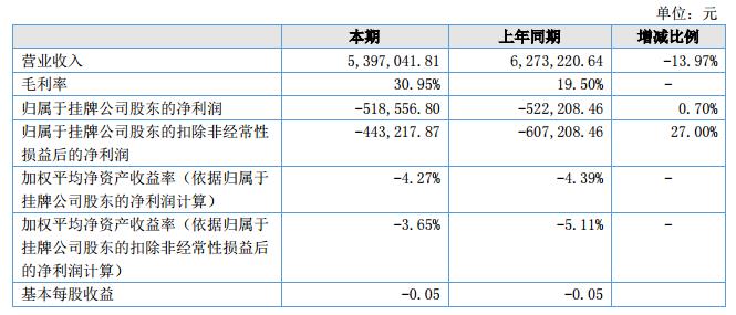 報(bào)告期內(nèi)公司實(shí)現(xiàn)銷售收入5,397,041.81元,較上年同期下降876,178.83元,同比下降13.97%;凈利潤(rùn)-527,503.90元,較上年同期下降5,295.44元,同比下降1.01%。?