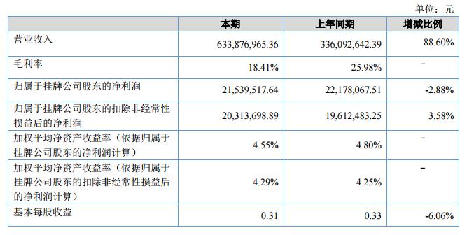 報告期內(nèi)公司營業(yè)收入633,876,965.36元,2017年上半年營業(yè)收入336,092,642.39元,同比增長88.60%;凈利潤21,149,148.89元,2017年上半年凈利潤21,677,213.80元,同比下降2.44%?。
