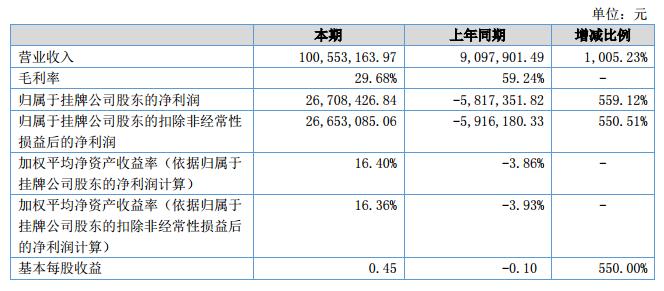 報告期內(nèi)公司實現(xiàn)營業(yè)收入100,553,163.97元,較上年同期增加了91,455,262.48元,收入比上年同增長了1,005.23%;營業(yè)成本70,704,767.44元,較上年同期增加了66,996,163.72元,成本較上年同期增長了1,806.51%;公司凈利潤26,708,426.84元,較上年同期增加了32,525,778.66元,增長率為559.12%。