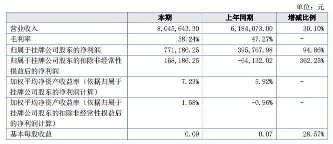 報告期內(nèi)公司實(shí)現(xiàn)營業(yè)收入8,045,643.30元,較上年同期增長30.10%;公司凈利潤為771,186.25元,較上年同期上升94.86%。?