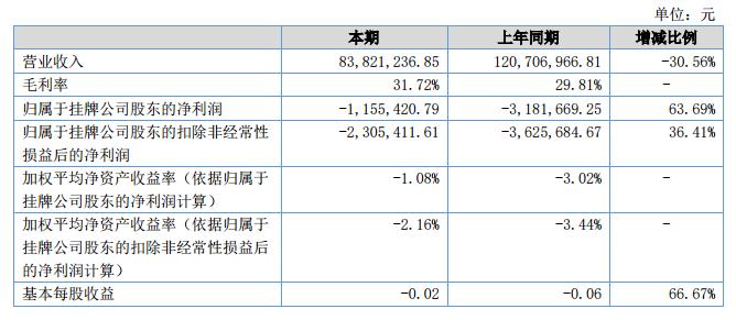 報告期末,公司實現(xiàn)營業(yè)收入83,821,236.85元,較上年同期減少30.56%;凈利潤虧損1,155,420.79元,較上年同期增加63.69%,凈利潤虧損較上年同期減少的原因為公司期間費用的減少。?
