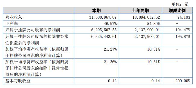 報(bào)告期內(nèi)新簽合同7000余萬元,實(shí)現(xiàn)營(yíng)業(yè)收入3,150.10萬元,比去年同期1809.40萬元增長(zhǎng)了74.10%,歸屬于掛牌公司股東凈利潤(rùn)增加424.77萬元,比去年同期增長(zhǎng)207.43%。資產(chǎn)總額增長(zhǎng)7.36%,負(fù)債總額下降20.08%,凈資產(chǎn)增長(zhǎng)23.80%。?