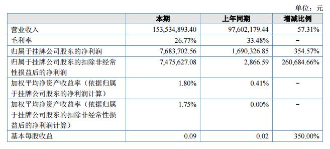 報(bào)告期內(nèi),公司實(shí)現(xiàn)營業(yè)收入153,534,893.40元,同期增加57.31%;達(dá)成歸屬于掛牌公司股東的凈利潤7,683,702.56元,同期增長354.57%。?