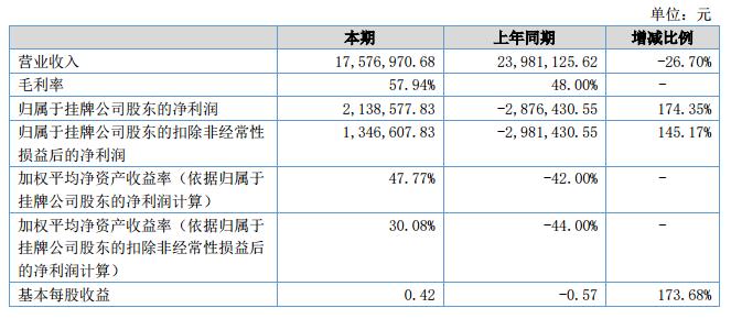 報告期內(nèi),公司實現(xiàn)營業(yè)收入17,576,970.68元,較去年同期下降26.70%;公司實現(xiàn)凈利潤2,138,577.83元,同比增長174.35%?。