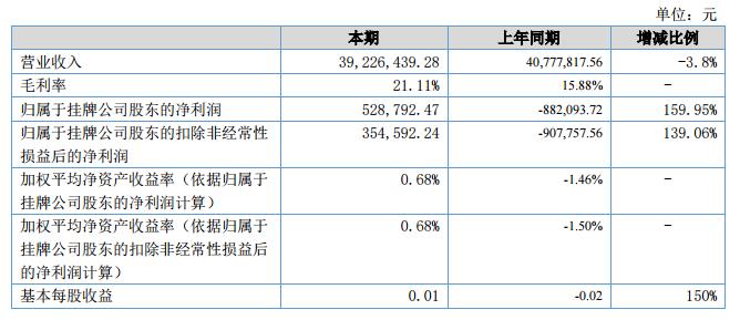 報告期內(nèi),公司實(shí)現(xiàn)營業(yè)收入39,226,439.28元,較上年同期減少1,551,378.28元,實(shí)現(xiàn)歸屬于母公司股東凈利潤528,792.47元,比去年同期增加1,410,886.19元。?
