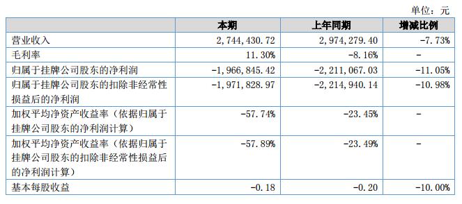 報(bào)告期內(nèi)公司主營(yíng)業(yè)務(wù)收入為2,744,430.72元,比去年同期下降7.73%;營(yíng)業(yè)成本為2,434,290.86元,比去年同期下降24.33%;歸屬母公司的凈利潤(rùn)為-1,966,845.42元,比上年同期凈利潤(rùn)-2,211,067.03元虧損金額減少了11.05%?