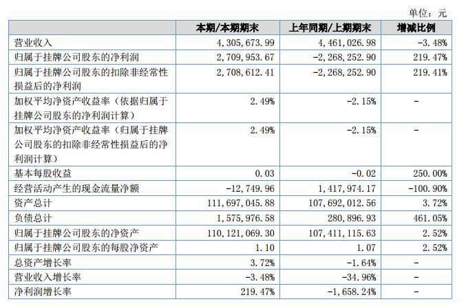 報告期內(nèi),公司利息總收入為549.35萬元,主要為發(fā)放貸款的利息收入;本期凈利潤為270.99萬元,比去年同期的凈利潤-226.82萬元增長了219.47%,?