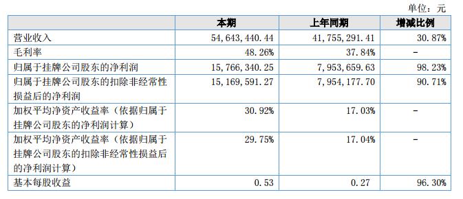 報(bào)告期內(nèi)公司實(shí)現(xiàn)營業(yè)收入約5464.34萬元,同比增長30.87%,歸屬于掛牌公司股東的凈利潤約1576.63萬元,同比增長98.23%。?