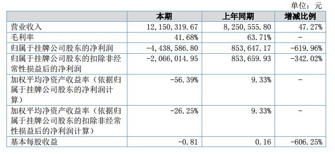 報告期公司實現(xiàn)營業(yè)收入12,150,319.67元,較上期同期增長了47.27%;歸屬于掛牌公司股東的凈利潤-4,438,586.80元,較上年同期減少619.96%。?