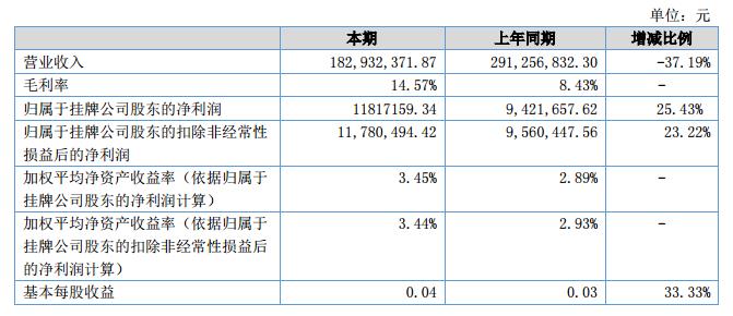 報告期內(nèi),公司營業(yè)收入為18,293.24萬元,同比減少37.19%,營業(yè)成本為15,628.08萬元,同比減少41.40%;公司實現(xiàn)凈利潤1,181.72萬元,較上年同期增長25.43%。?