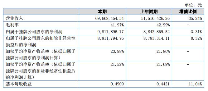 報告期內(nèi)公司實現(xiàn)營業(yè)收入69,668,454.54元,同比增長35.24%;公司凈利潤為12,385,292.03元,同比增長31.52%。?