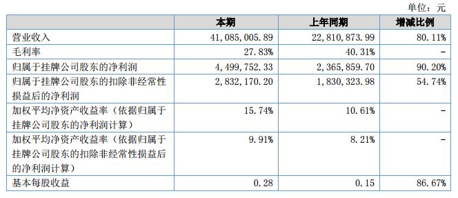 報(bào)告期內(nèi)公司營業(yè)收入增長80.11%,增加凈額1,827.41萬元;歸屬于母公司凈資產(chǎn)為2,784.03萬元,較期初增長5.69%,增加凈額149.98萬元。